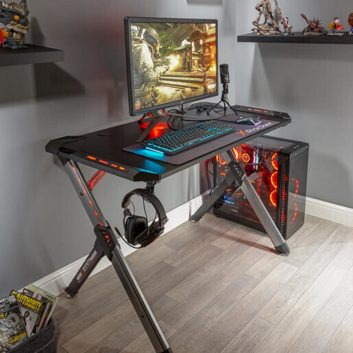 In a black and silver colour scheme, with orange accents and colour-changing LED inlays in the legs